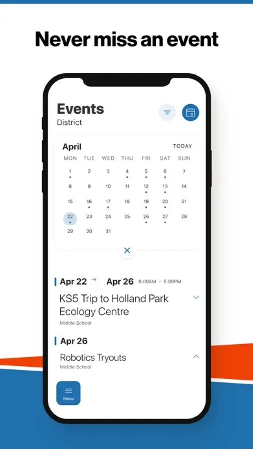 The event section shows a list of events throughout the district. Users can add an event to their calendar to share the event with friends and family with one tap.
