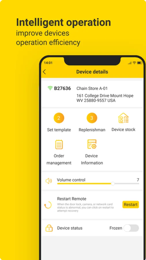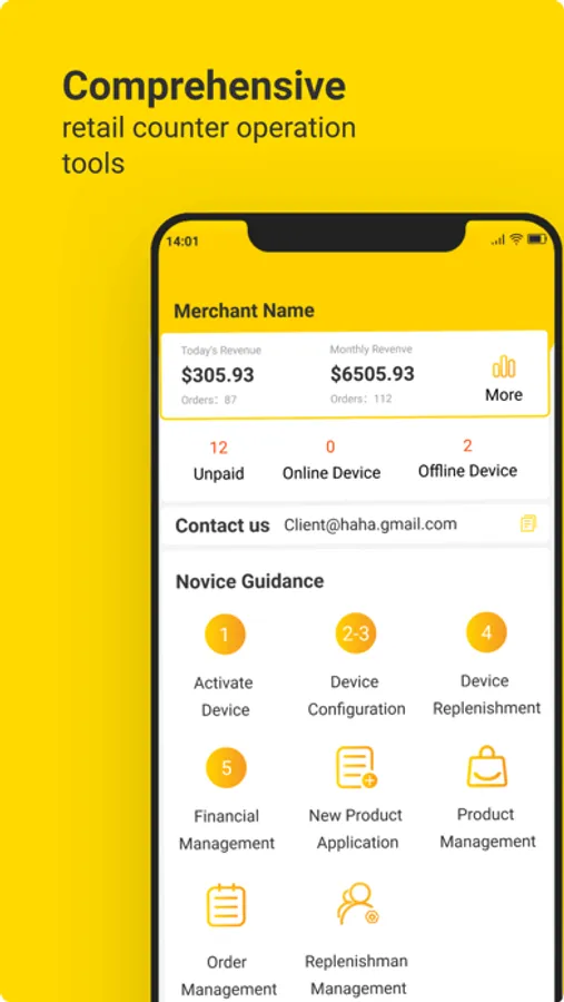 1. Device management: Set up online device listing products and restocking personnel information; Remote management device status.