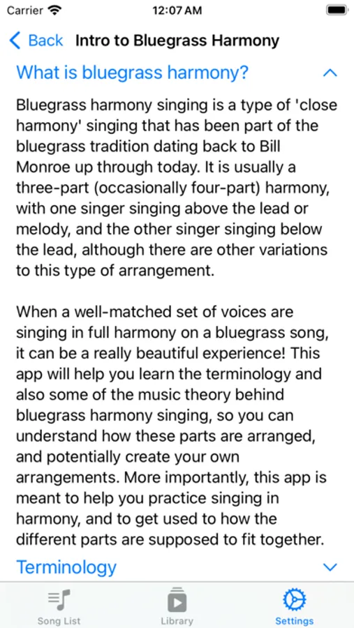 I think this is a really nice, authentic way to learn harmony parts to classic bluegrass and folk songs. I like that it’s not digitally tuned and overly perfect. That makes it easier to hear the genuine sound of the vocals. The app itself is easy to use and has all the features you’d need to learn bluegrass and folk harmonies, whichever part you’re interested in. Make sure to check out the written sections though, I think they’re really helpful.