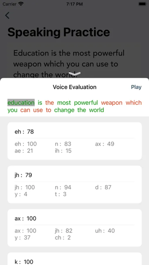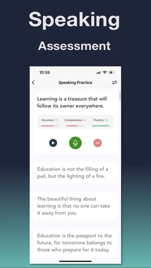 Real-time Speaking Assessment: Just follow a sentence in English, and our intelligent scoring system will automatically evaluate the accuracy of your pronunciation, pinpointing which words or phonemes need improvement, aiding you in precise pronunciation correction.