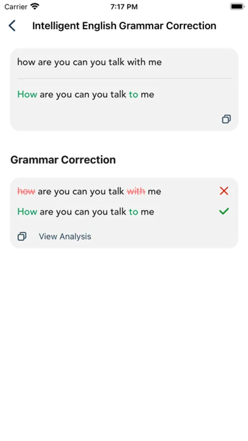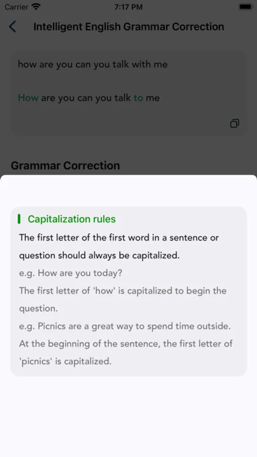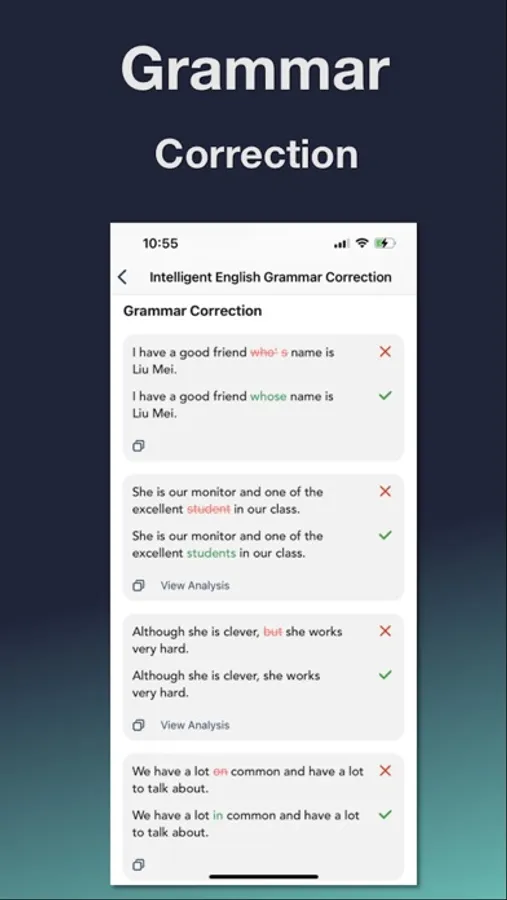 Smart AI Grammar Correction: Input an English sentence, and our AI will instantly detect and highlight any grammatical errors, providing detailed explanations, helping you learn the correct grammar usage.