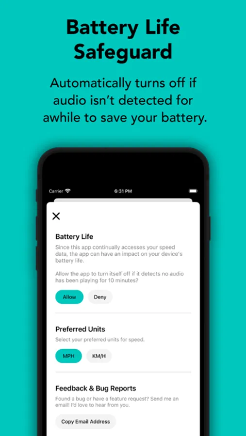 The app requires "Always" access to your location updates to continually gauge your speed even when the app is in the background, which may have an impact on your battery life. Although the app can be used all day, it's advisable to deactivate its control when not in use. Newer devices may experience less battery impact compared to older ones. The app will also automatically turn itself off if it detects no audio playback for a while, just in case you forgot to disable it.