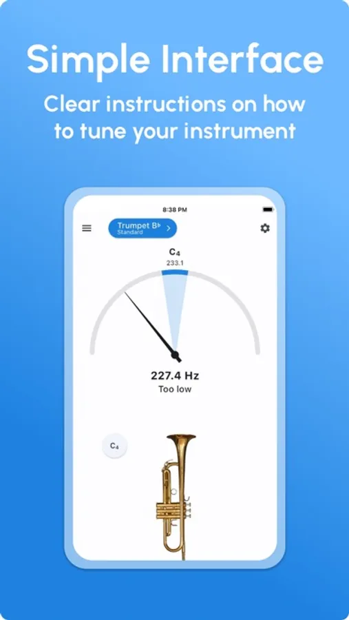 Tune the trumpet faster with the automatic mode. You can play any note, and we will properly detect it to give you hints on how to tune a trumpet.