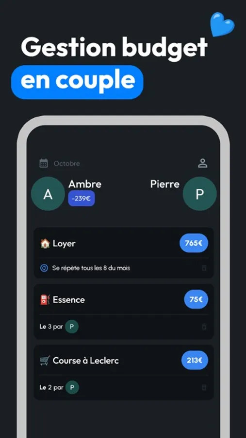 1. 2Split est la seule application de gestion de budget créée à 100% pour les couples ; tout a été pensé dans le but de faciliter le partage des dépenses pour deux.