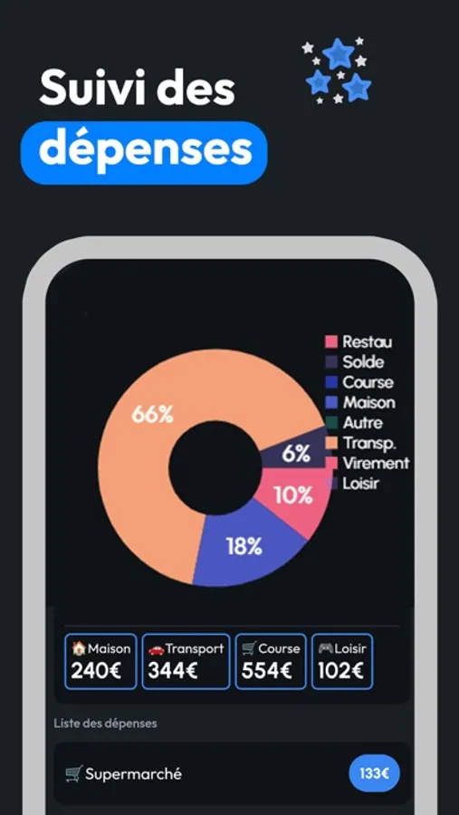 - Statistiques de votre budget : visualisez et comprenez où vous dépensez votre budget.