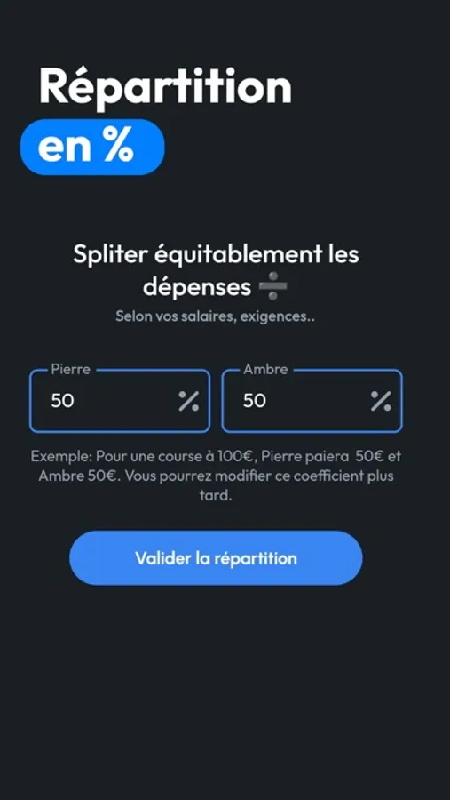 - Choisissez une répartition des dépenses en pourcentage (en fonction de vos envies, salaires, etc.)