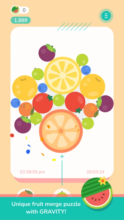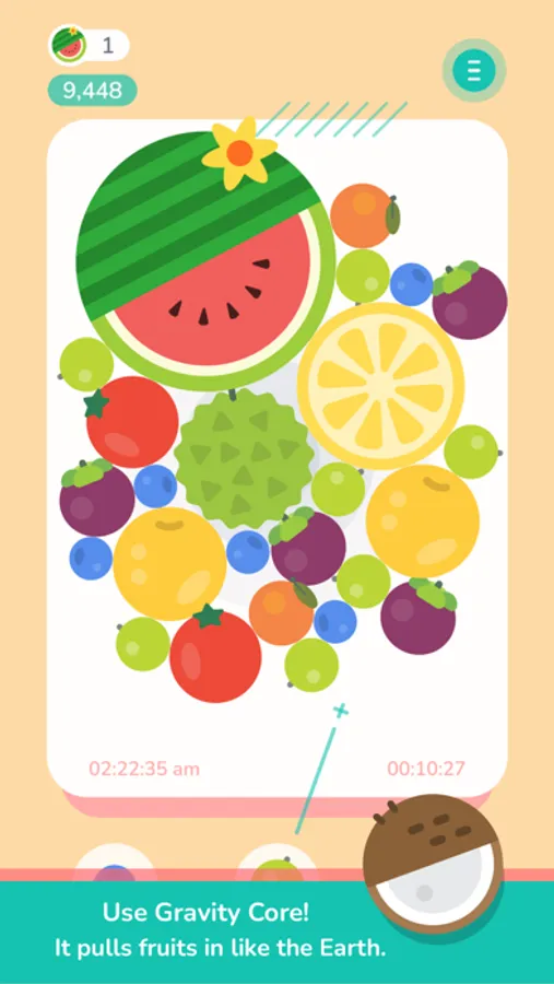 At the center of space is a gravity core, pulling everything toward it, just like on Earth. Shoot fruits in any direction and watch them float, waiting to merge with their matching friends.