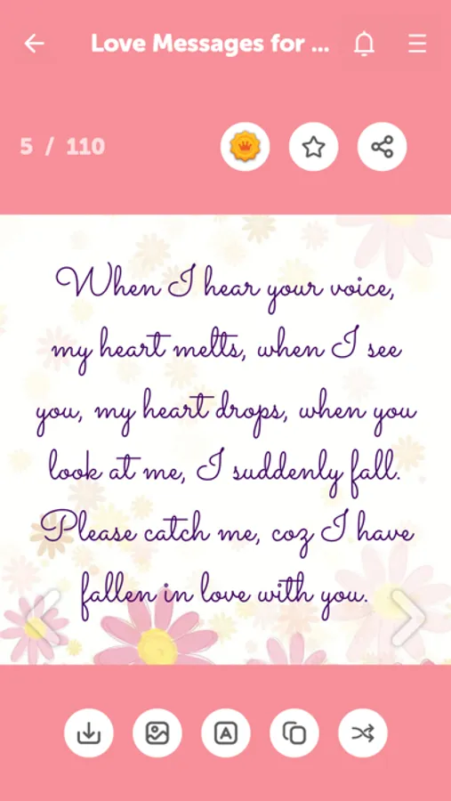 Want an app with romantic love message? This is the app contains 10000+ love messages in more than 30 categories. With this app you can easily express your feelings to your love, your girl or boy friend. You can show your love easily. You have full access to all the categories of messages and copy or share the messages with just one click.