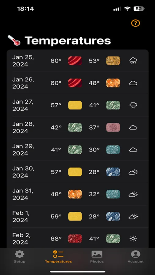The hardest part of making a temp blanket is keeping track of daily temperatures. This app keeps a daily list and shows the color you have assigned to that temp. It alleviates all those spreadsheets! Saves tons of time. Well worth the price.