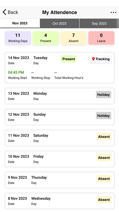 This application allows features to users for their day-to-day activities like - punch-in and punch-out, check-in and check-out, place order, apply leave, etc.