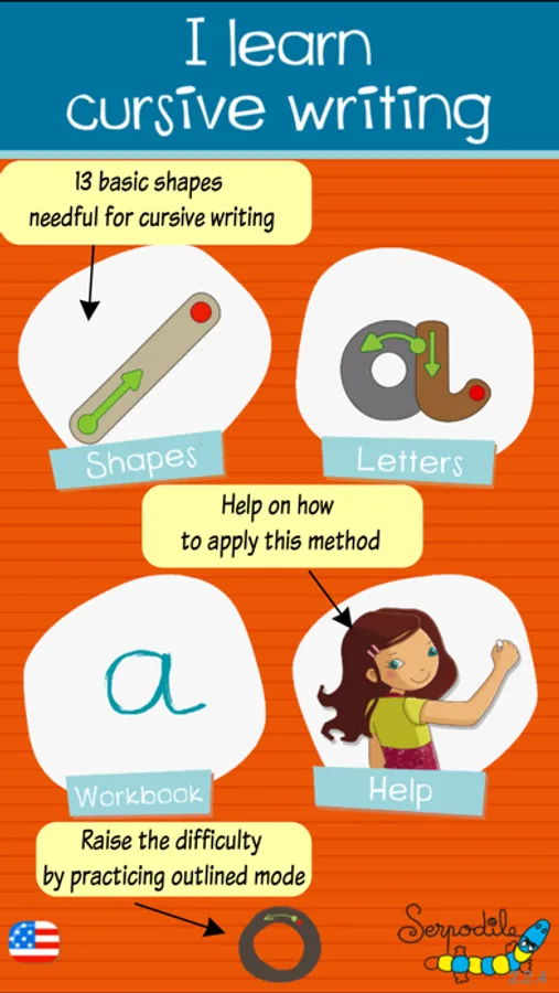 Serpodile offers a new method for learning cursive writing by decomposing the 26 letters of the alphabet in 13 basic shapes (circle, candy cane...) using visual and audio directions.