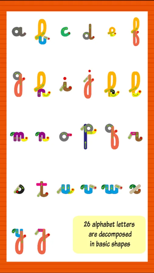 4 basic shapes and 6 letters are available in this free lite version. The full version is available in the app store with all 13 basic shapes and 26 letters at https://itunes.apple.com/fr/app/cursiveshd/id611725294