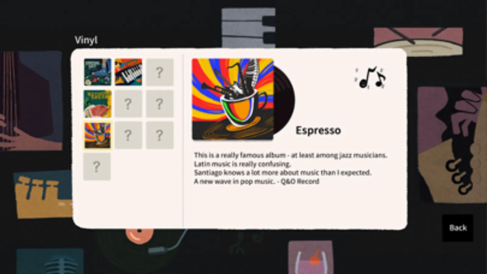 Interact with various spots around the city of Evans and encounter other characters to discover rare music albums. From tango to bossa nova, cool jazz to modern jazz, collect a wide range of albums and enrich your rhythm plays.