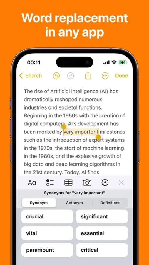 Improve your writing with alternative word suggestion with a thesaurus built right into your keyboard.