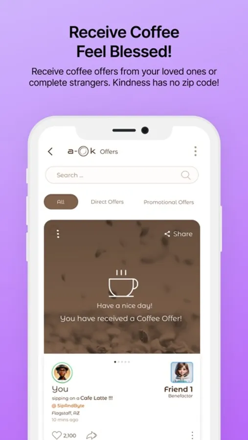 Spontaneous Joy: Delight in giving or receiving spontaneous coffee offers with our "Feeling Blessed" feature, adding serendipity to your day.