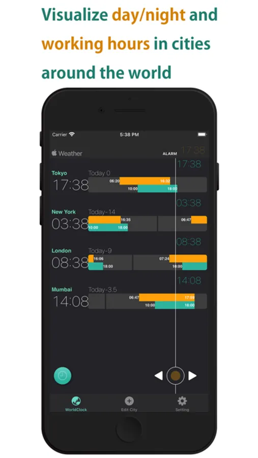 ・Graph of day/night and working hours in each city. - Day and night time will be updated automatically every day. Working hours can be changed manually for each city.