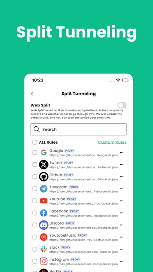 • Split Tunneling (App & Website Routing) — Select which apps or websites go through VPN and which connect directly for optimal speed