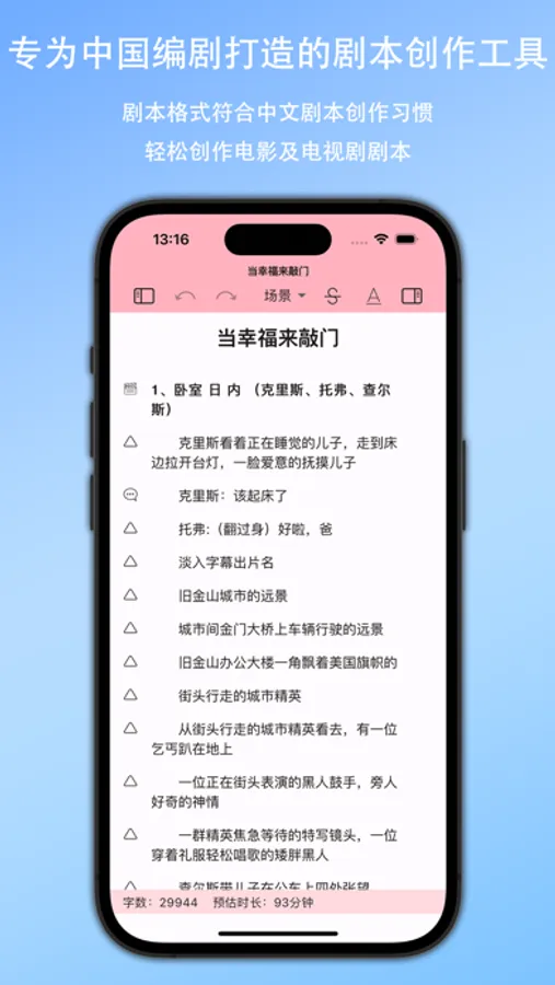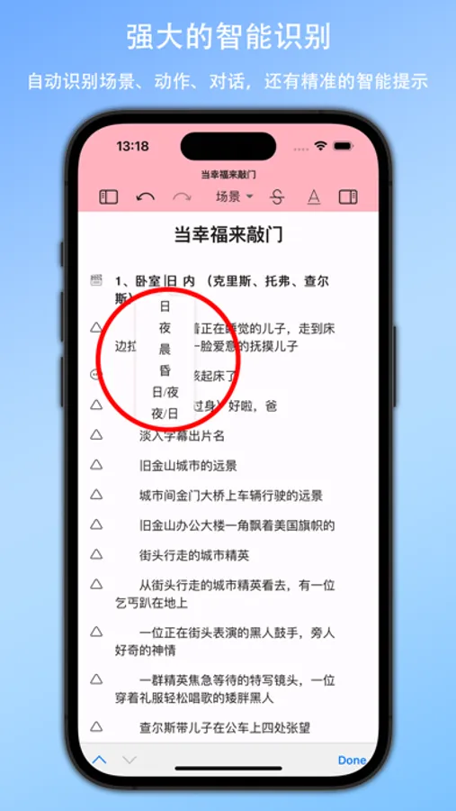 场号、场景、动作、对话自动识别并标记。时间、空间、出场人物精准提示,极大减少剧本创作时的思绪干扰。