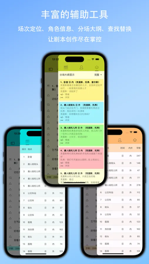 角色出场次数、场景快速定位、分场大纲提醒……随时掌控全部信息。