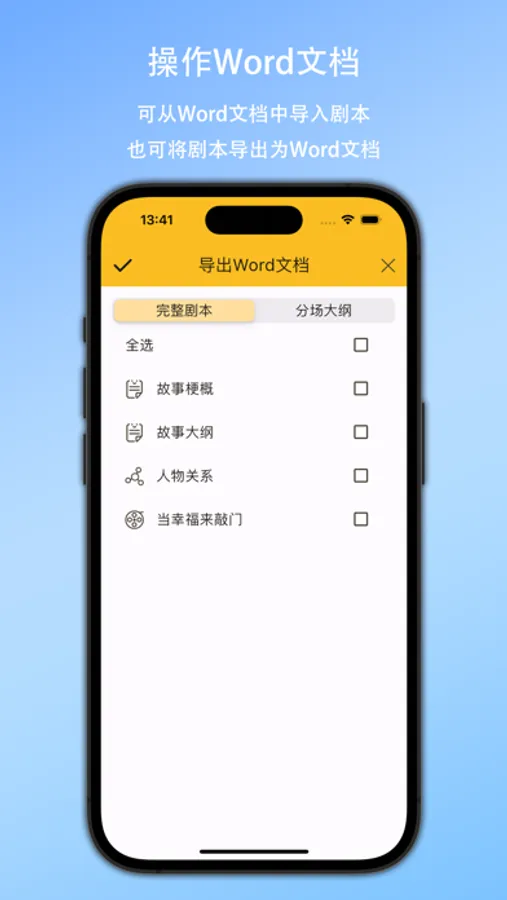 支持电影、电视剧、短视频、微短剧等所有剧本的创作,并自动匹配中文剧本的格式;支持剧本大纲、分集大纲、人物关系的创作。可轻松将剧本导出为Word文档,也可将Word文档导入到剧本中。