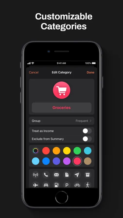 • Customize categories with various icons and colors.