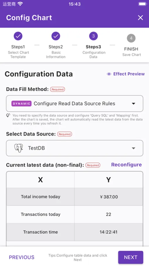 3. Chart creation; users can select chart templates in the App and associate data sources to complete chart mapping configuration. Supports manual selection of mapping or SQL query mapping.