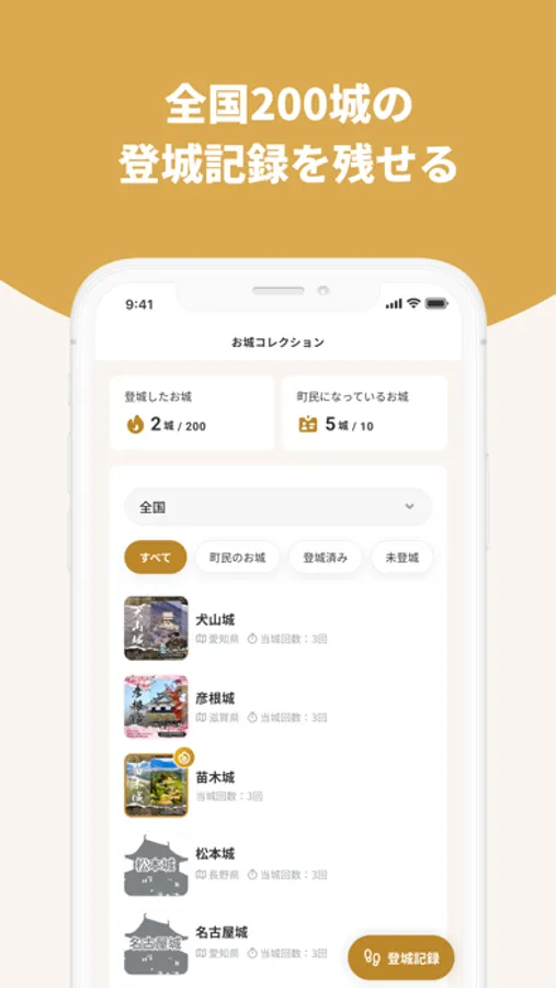 ・全国200城の「登城記録」を残せる