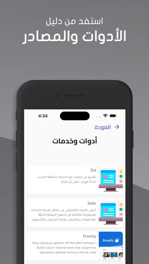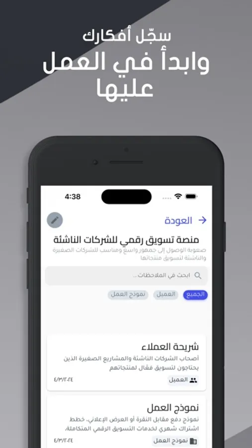 ابدأ رحلتك الريادية بإتباع خطوات عملية واضحة مع التطبيق المثالي لدعم رواد الأعمال الطموحين والشركات الناشئة في السعودية. استفد من مجموعة كبيرة من الموارد والأدوات المصممة لمساعدتك في توليد أفكار مبتكرة، فهم أساسيات ريادة الأعمال، وإثراء معرفتك ومهاراتك باستمرار، لإطلاق مشاريع ريادية ناجحة بإذن الله!