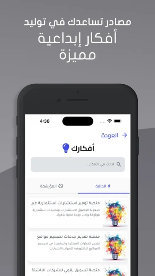 يساعدك التطبيق في توليد العديد من الأفكار الإبداعية والتي يمكن تحويلها إلى مشاريع ريادية من خلال تزويدك بأدوات ومصادر فريدة وسهلة الفهم.