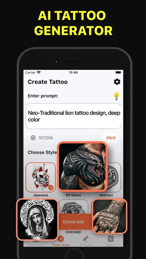 AI Tattoo Design Tattoo Maker is your ultimate app for seamless tattoo creation. Unleash your creativity with this intuitive and innovative tool that employs artificial intelligence to generate unique and personalized tattoo designs. Explore a vast library of styles, symbols, and themes, or upload your own images for a truly custom experience.
