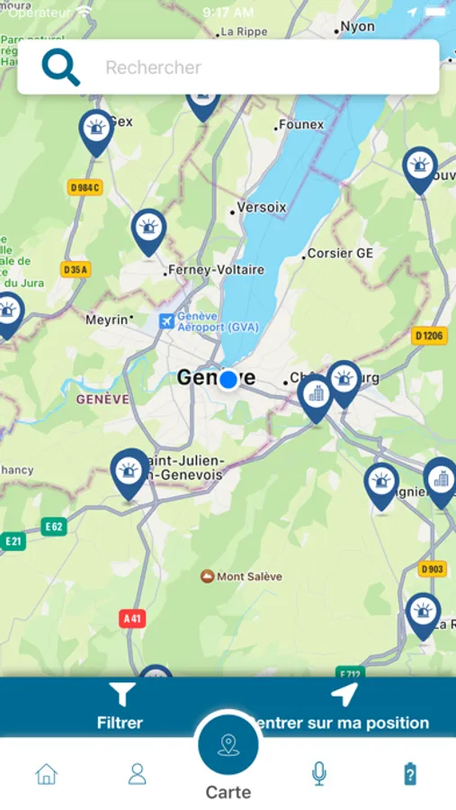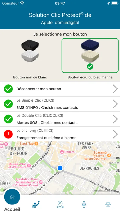 L’application CLIC PROTECT offre également une carte dynamique interactive qui fait office de GPS pour l’accès aux points d’urgence (Police, Gendarmerie, Hôpital)