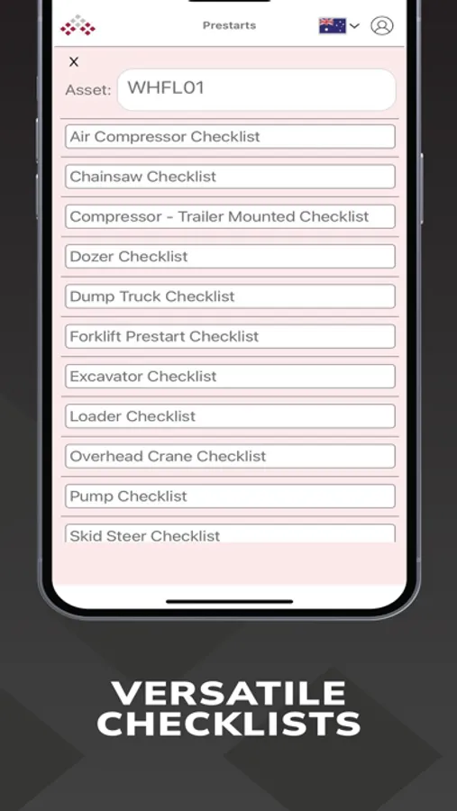 - Choose from 15 prestart checklists available by default in the system, tailored to diverse equipment and operational requirements.