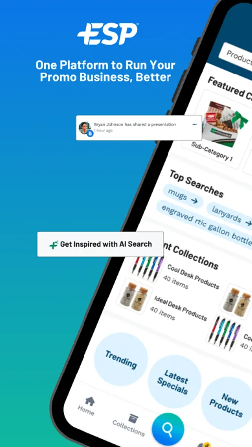The ESP+ App is the newest way to manage your business on the go. It has everything you need to search and find new products for your clients (including AI-fueled search for out-of-the box promo ideas), create collections of your favorite products, and receive real-time notifications to stay on top of projects, whenever.
