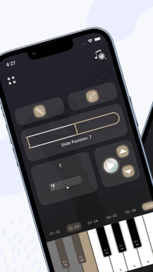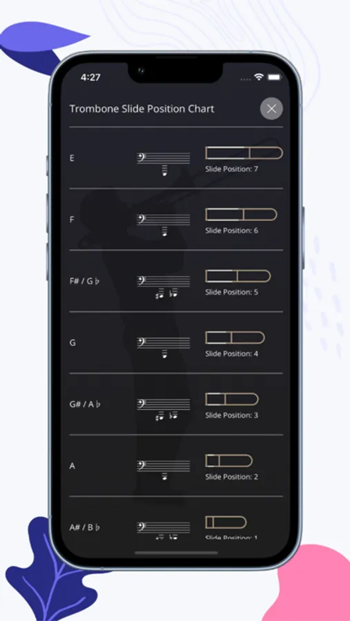 Become a trombone virtuoso with our interactive app designed for trombonists of all levels! Whether you're a beginner or a seasoned professional, our app is your ultimate tool for mastering the Trombone Slide Position Chart effortlessly. Practice with ease, learn quickly, and perfect your skills using our app's metronome, tuner, trombone slide position chart quiz, detailed frequency information (Hz) for each note, and virtual trombone. Start your musical journey today!