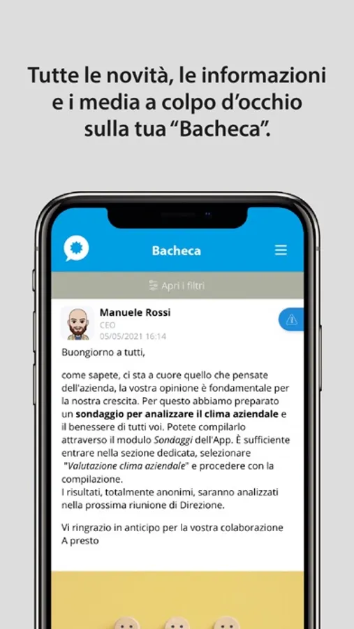 Consente di ricevere aggiornamenti in tempo reale sulle novità aziendali come in un vero e proprio social network. Tutte le novità, le informazioni e i media sono raggiungibili a colpo d’occhio. Per rimanere connessi con i collaboratori in real time e leggere le notizie rimanendo sempre aggiornati sulle novità dell’azienda e del network.