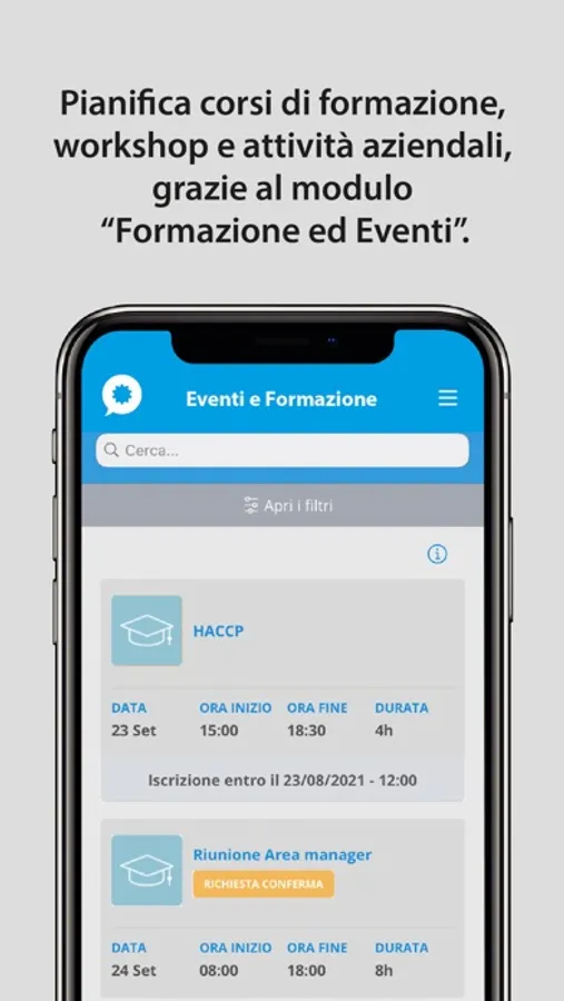 Consente di organizzare varie attività dentro e fuori dall’azienda o dalla community come ad esempio i corsi di formazione o la gestione degli eventi per dipendenti e collaboratori. Consente inoltre di rilevare le presenze ad ogni evento.