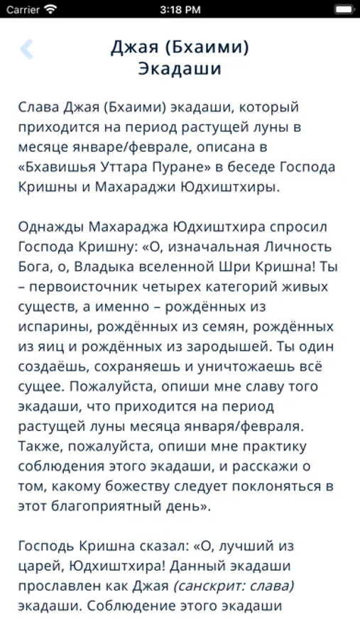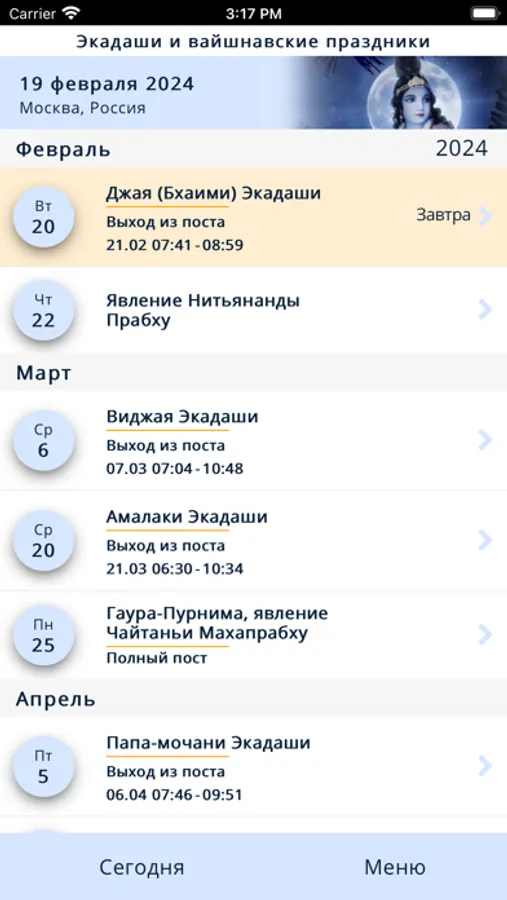 База данных приложения содержит даты и описания всех Экадаши и основных Вайшнавских праздников в расчете для всех крупных городов мира.