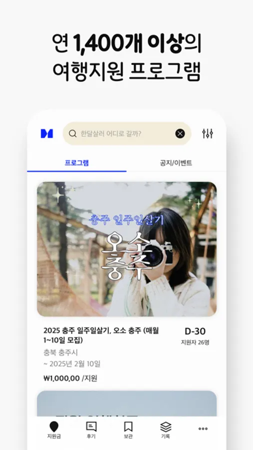짧은 여행부터 장기 체류까지 국내에 다양한 지자체 여행지원 프로그램이 있는거 알고 계셨나요? 몰랐다면 지금 바로 한달살러를 통해 국내 다양한 지자체 프로그램을 만나보세요. 3만원부터 150만원까지! 한달살기 비용 부담도 줄이고, 생각지 못한 낯선곳으로 여행을 떠나보세요.