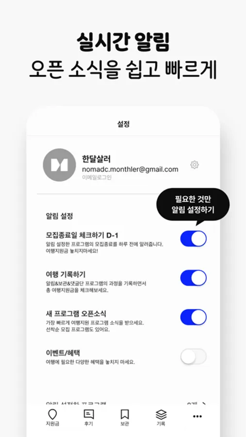 새 프로그램을 놓치지 마세요! 선착순으로 모집하는 프로그램을 놓치지 않을 수 있는 기회에요. 어렵게 정보를 얻지말고 한달살러에서 쉽고 빠르게 정보를 얻으세요. 그룹방에 들어가거나 SNS를 통해 활동하지 않아도 한달살러만 있으면 지원 프로그램을 놓치지 않을 수 있어요.