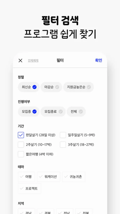 키워드 검색뿐만 아니라 지역별, 테마별, 기간별 원하는 여행 프로그램을 찾아보세요. 일주일살기 한달살기 여행뿐만 아니라 일과 여행을 함께하는 워케이션, 소도시 관계인구를 위한 프로젝트, 5도2촌 또는 귀농귀촌 등 다양한 프로그램을 만날 수 있어요. 디테일한 필터 검색은 그동안 운영 노하우를 통해 정밀하게 분류되었고 지속적으로 고도화되고 있어요.