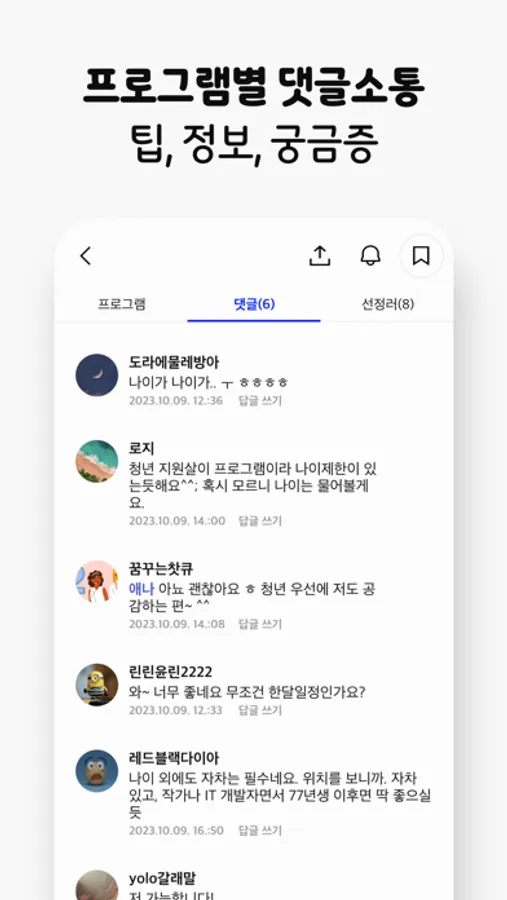 프로그램별 댓글이 열려있어요. 궁금한 것도 물어보고, 알고 있는 팁도 공유해보세요. 생각지 못한 정보를 얻을 수 있어요.