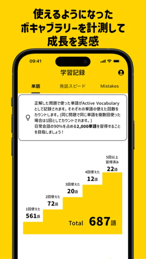 We automatically track the English words you use correctly and count them as part of your Active Vocabulary. Aim to master the 2,000 most essential words for daily conversation—fast.
