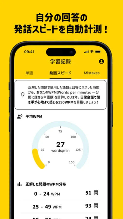 Using that data, it calculates your Words Per Minute (WPM) so you can track your average speed and progress toward fluent, native-like communication.