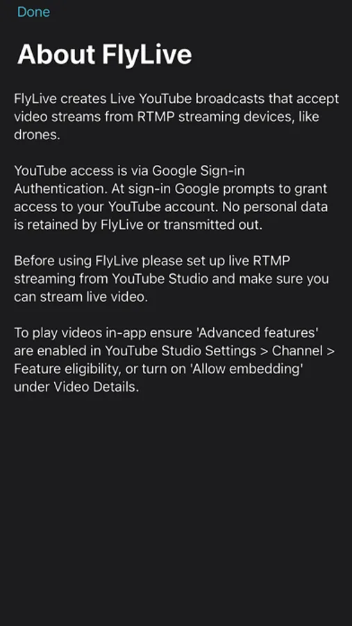 YouTube access is via Google Sign-in Authentication that asks for access to your YouTube account. No personal data is retained by FlyLive or transmitted out.