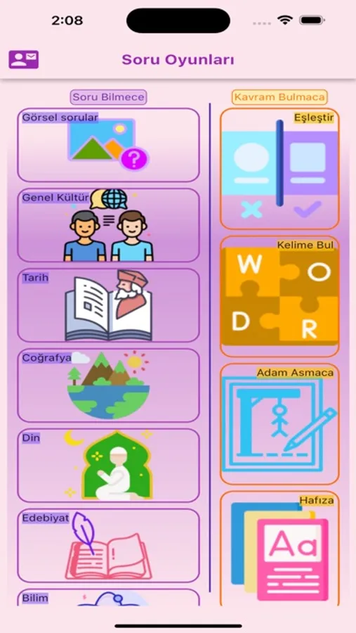 Uygulamamız ile yüzlerce Tarih, Genel Kültür, Coğrafya, Din, Edebiyat ve Bilimsel bilgileri farklı soru uygulamaları ile oynayarak beyin gelişimine katkısını göreceksiniz. Görsel Soru Bilmece, Adam Asmaca oyunu, Eşleştirme, Hafıza ve Kelime yapboz oyunu ile farklı öğrenme deneyimleri elde edeceksiniz. Türkçe sunulan bu soru bilmece ve kelime bulmaca oyunlarımız ile sözcükleri ve kavramları zihin yorarak bulmacaları çözüp hem eğlenip hem de beyin gelişimine katkısını göreceksiniz.