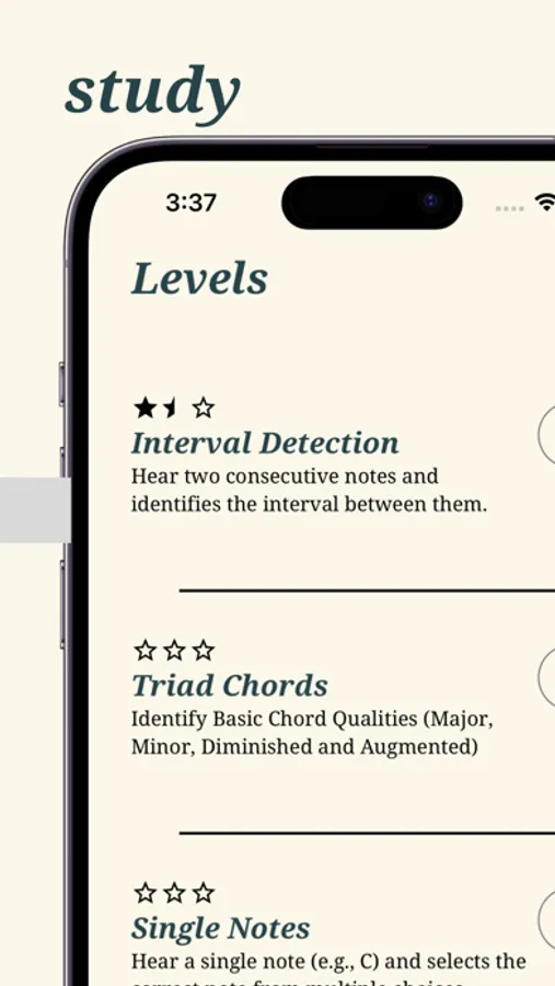 This app is meant for beginners and intermediate musicians looking to level up. If you've ever heard a tune and want to be able to say, "mom, that's a D diminished resolving to a A minor sixth chord", or if you want to annoy your partner with your excellence in hearing harmony, this app is for you! Getting there is definitely a journey, but we try to make it easy for you to start.