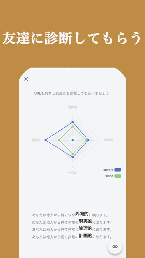 自己分析だけでなく、友人による評価機能を通じて、自己認識と他者からの視点を比較することができます。これにより、自己理解が一層深まります。