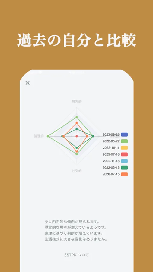 過去の診断結果と比較することで、時間とともに変化するあなたの性格の傾向を把握できます。成長の過程を可視化し、自己理解をさらに深めることができます。
