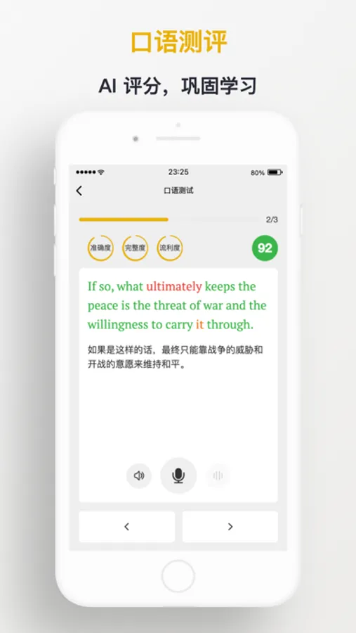 AI 测评口语,从完整度、流利度、准确度等维度准确评估并检验学习成果。
