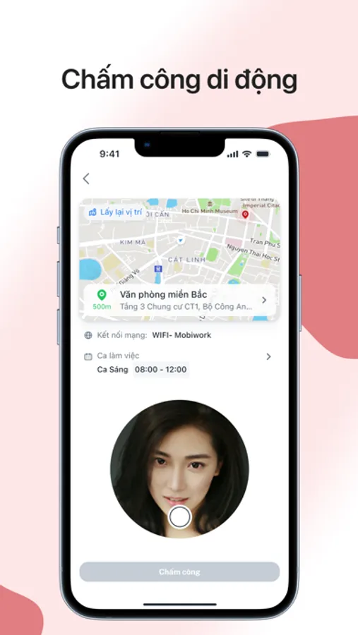 Nhân viên sử dụng di động để chấm công dựa trên khuôn mặt của mình sử dụng công nghệ nhận diện khuôn mặt. Cụ thể, hệ thống sẽ sử dụng camera để chụp hình khuôn mặt của người dùng, sau đó sử dụng các thuật toán và công nghệ nhận diện khuôn mặt để xác định danh tính của người dùng. Sau khi xác định được danh tính của người dùng, hệ thống sẽ ghi lại thời gian chấm công ra và chấm công vào để tính toán số giờ làm việc của nhân viên.